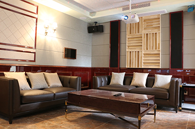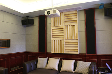 這是一間30平方米左右的獨(dú)立影院空間,這個(gè)房間雖然看不到音響設(shè)備,但實(shí)際是融合了5.1.4的全景聲影院。房間雖然不是很大,項(xiàng)目初期,在聲學(xué)設(shè)計(jì)上花了不少心思,為了克制平行墻面的震蕩回聲現(xiàn)象,中間空余位置填充了吸音材料,盡量把影視廳混響控制在0.4-0.5區(qū)間。