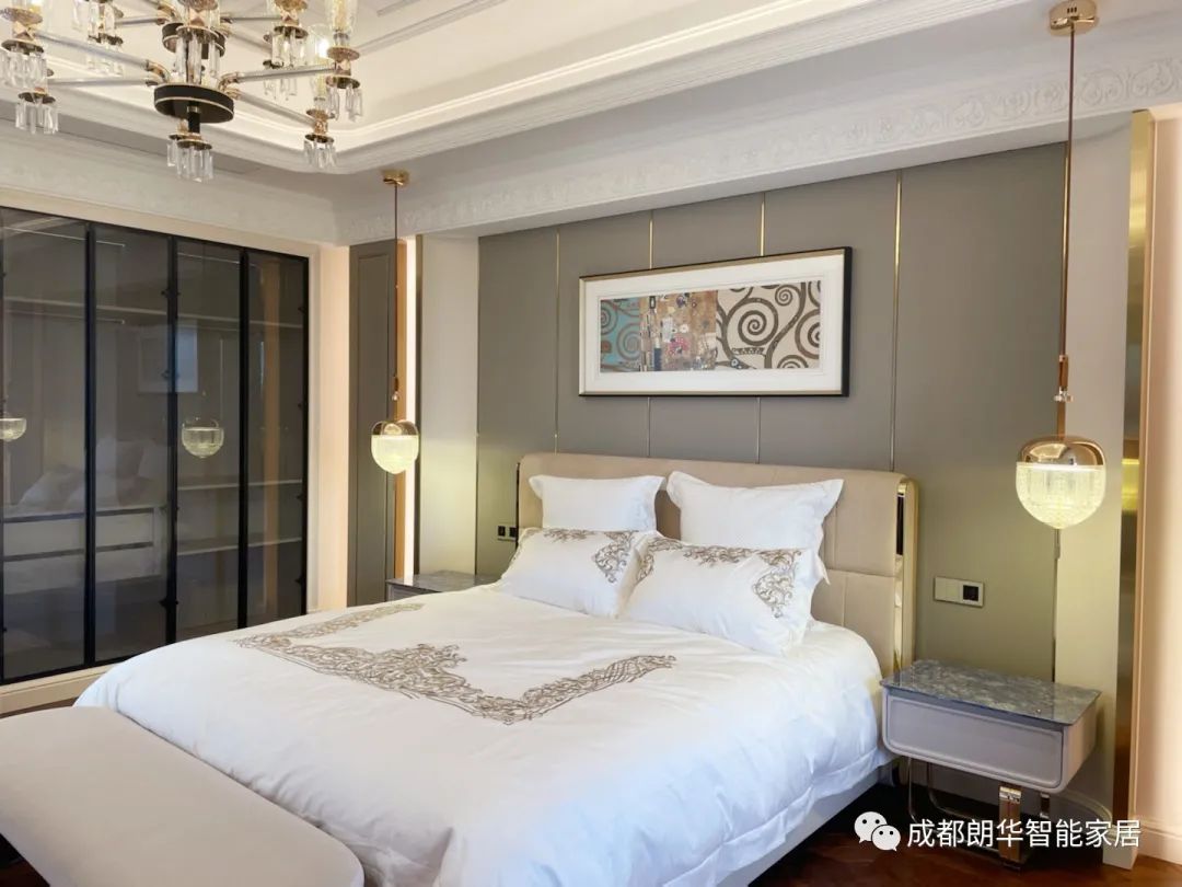 業(yè)主家里客廳、餐廳、主臥室的窗簾全部是智能控制的,設(shè)計師設(shè)置成日落后兩個臥室窗簾自動關(guān)閉,早上按“晨起”時,臥室布簾輕輕打開,在任何地方,家中的所有窗簾都可以通過墻面開關(guān)、觸摸屏或是手機來控制。