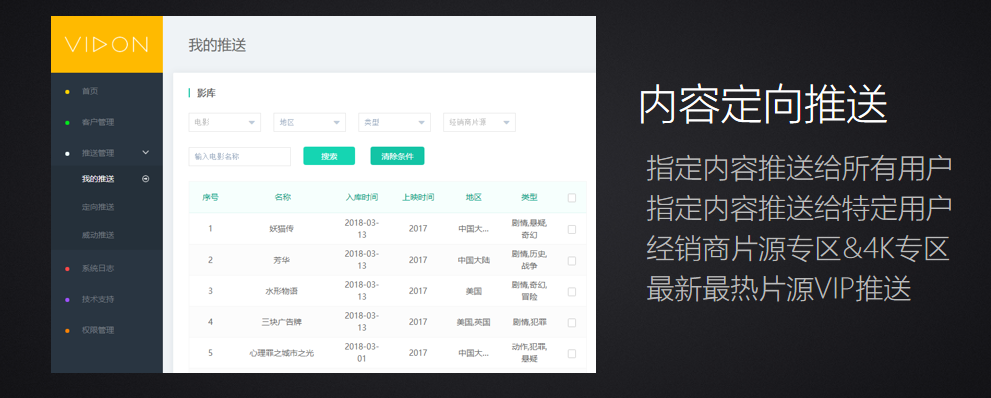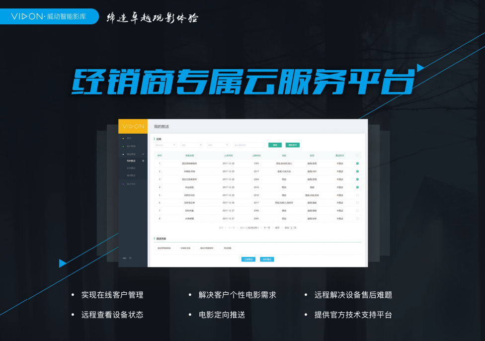 影音集成商可通過經(jīng)銷商云平臺定向推送影片至終端用戶,無需用戶操作,一鍵推送并自動下載,可根據(jù)云片庫提供的影片進行運營規(guī)劃,滿足用戶的定制內(nèi)容需求,提升自身的運營實力,實現(xiàn)個性化運營。